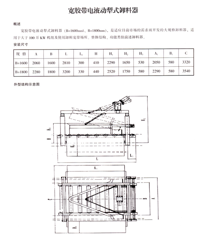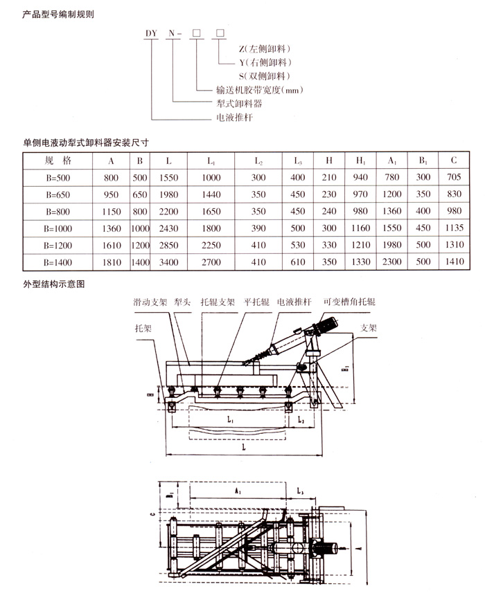 DYN-IV型電液動犁式卸料器,是我公司和電力部中南電力設計院聯合開發的產品之一,是安裝在膠帶輸送機上執行卸料及控制物料輸送流量、流向的機械配套產品,可直接安裝在膠帶輸送機的中間架上,能將膠帶輸送的物料在中途均勻、連續地卸入漏斗(料斗)中,或卸到需要的場所去。